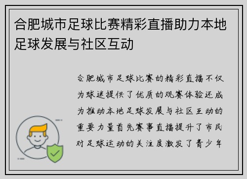 合肥城市足球比赛精彩直播助力本地足球发展与社区互动